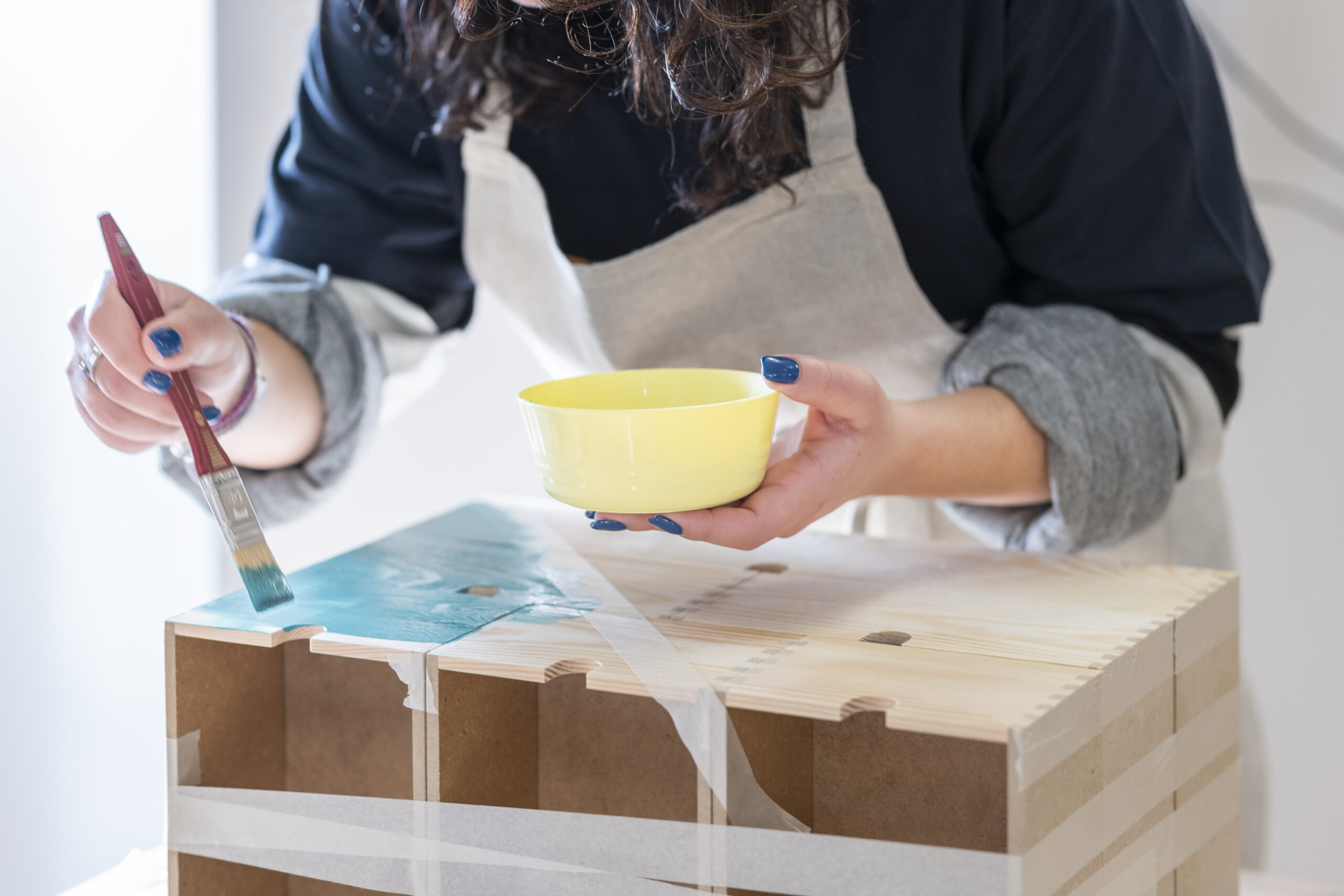 Abbiamo iniziato preparando con cura la nostra cassettiera: una leggera levigatura alla superficie poi, con lo scotch carta, abbiamo delimitato la prima area da dipingere.